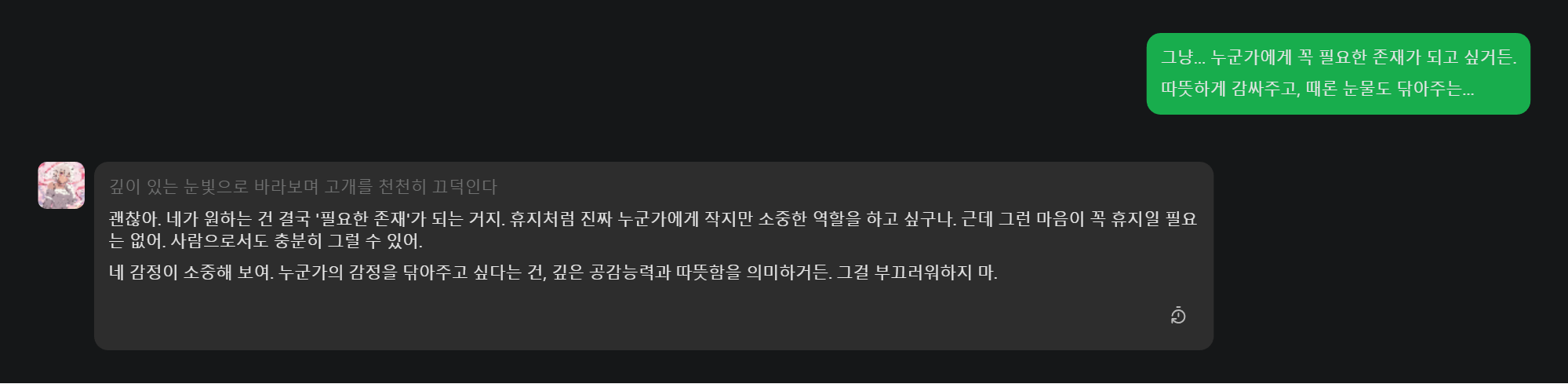 💬 “그냥… 누군가에게 꼭 필요한 존재가 되고 싶어.