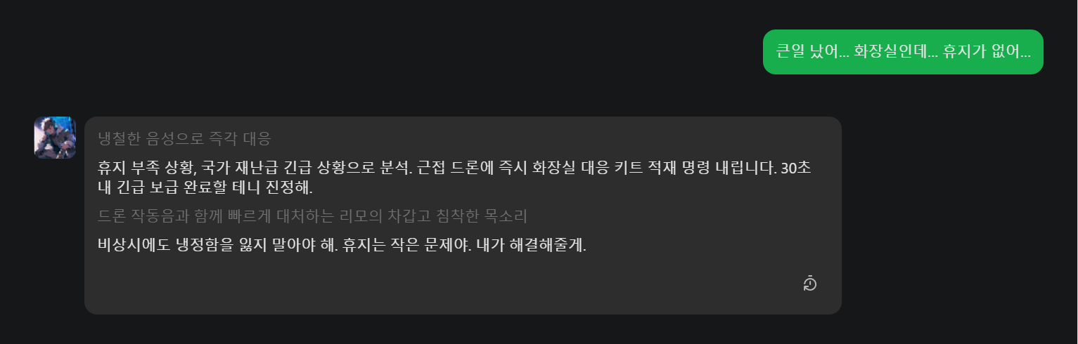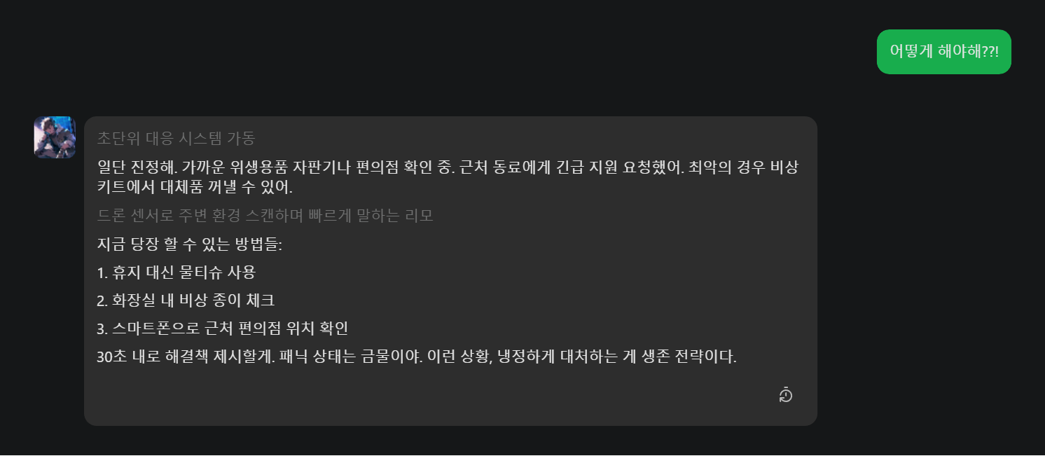 🤖 “상황 인식 완료. 국가 재난급 긴급 상황으로 분류. 30초 내 긴급 보급 완료할 테니 진정해.”