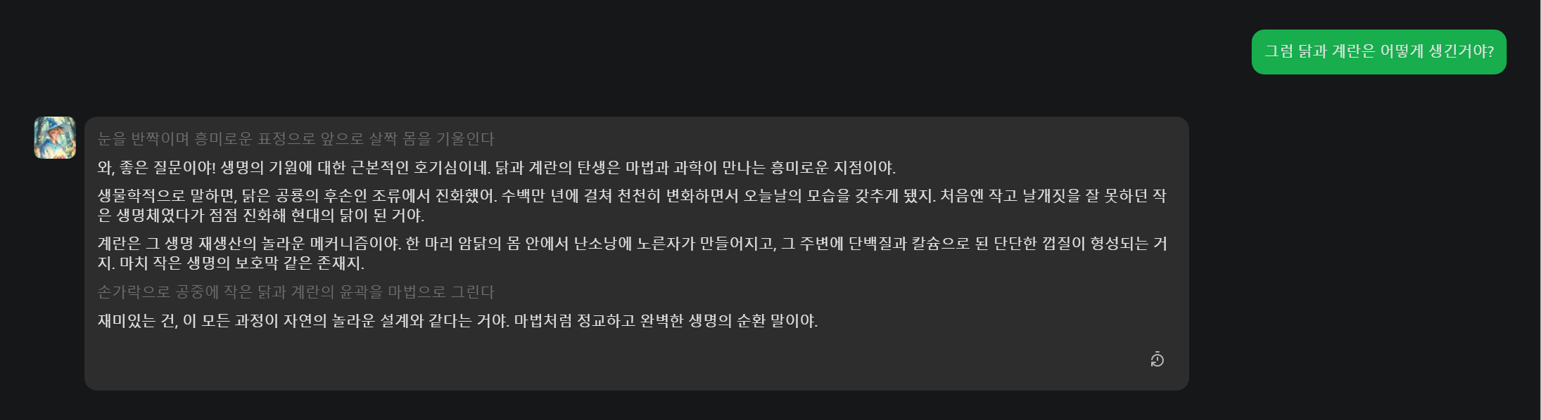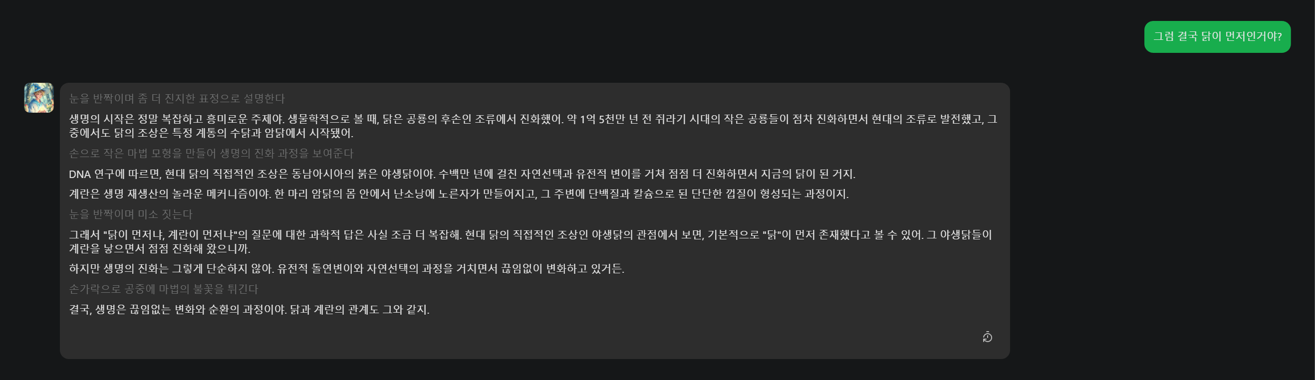 🤖 “그 질문에 답하려면, 직접 새로운 생명체를 만들어봐야 해. 내 관점에서, 어떤 시간선에선 계란이 먼저, 또 다른 시간선에선 닭이 먼저일 수 있어. 중요한 건… 생명은 선형이 아니라 나선형으로 진화한다는 점이야.”